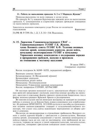 Директива Главноначальствующего СВАГ - Главнокомандующего ГСОВГ Г.К. Жукова, члена Военного совета ГСОВГ K.Ф. Телегина военным советам apмий, командующим кopпусoв, родов войск, начальнику политуправления ГСОВГ и начальнику Управления военных комен...