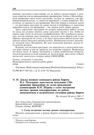Доклад военного коменданта района Киритц И.A. Потальцева заместителю начальника СВА провинции Бранденбург по делам гражданской администрации B.M. Шарову о схеме построения местных органов самоуправления, их работе, экономическом и политическом состоянии района Киритц. Не позднее 24 июля 1945 г.