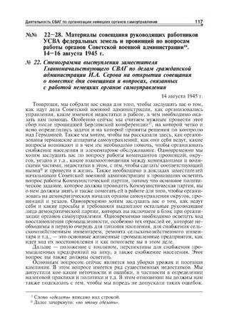 Материалы совещания руководящих работников УСВА федеральных земель и провинций по вопросам работы органов Советской военной администрации. 14-16 августа 1945 г. Стенограмма выступления заместителя Главноначальствующего СВАГ по делам гражданской ад...