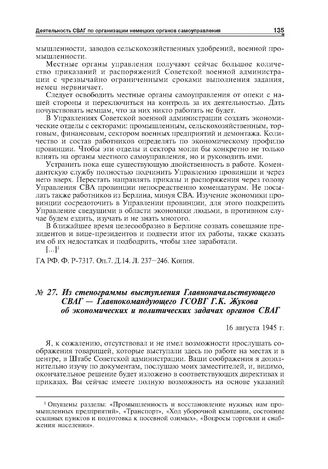 Материалы совещания руководящих работников УСВА федеральных земель и провинций по вопросам работы органов Советской военной администрации. 14-16 августа 1945 г. Из стенограммы выступления Главноначальствующего СВАГ - Главнокомандующего ГСОВГ Г.К. Жукова об экономических и политических задачах органов СВАГ. 16 августа 1945 г.