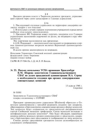 Письмо начальника УСВА провинции Бранденбург B.M. Шарова заместителю Главноначальствующего СВАГ по делам гражданской администрации И.А Серову о необходимости создания при органах самоуправления совещательных комиссий. 13 апреля 1946 г. // ГА РФ. Ф. Р-7077. Оп. 1. Д. 31. Л. 154. Подлинник.
