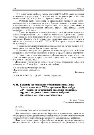 Указание исполняющего обязанности начальника Отдела пропаганды УСВА провинции Бранденбург С.P. Родионова начальникам отделений пропаганды округов о создании совещательных собраний при органах местного самоуправления. 24 мая 1946 г.