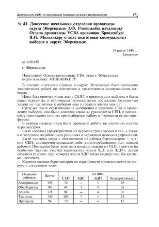 Донесение начальника отделения пропаганды округа Эберсвальде З.Ф. Розенцвайга начальнику Отдела пропаганды УСВА провинции Бранденбург Я.И. Мильхикеру о ходе подготовки коммунальных выборов в округе Эберсвальде. Эберсвальде, 14 июля 1946 г.