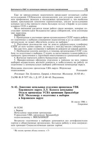 Донесение начальника отделения пропаганды УВК Берлинского округа Л.Л. Колосса начальнику Отдела пропаганды УСВА провинции Бранденбург Я.И. Мильхикеру о подготовке к выборам в Берлинском округе. Бернау, 16 июля 1946 г. // ГА РФ. Ф. Р-7077. Оп. 1. Д. 197. Л. 80-82. Подлинник.