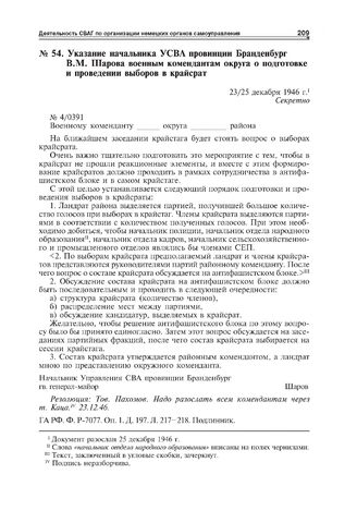 Указание начальника УСВА провинции Бранденбург B.M. Шарова военным комендантам округа о подготовке и проведении выборов в крайстат. 23/25 декабря 1946 г.