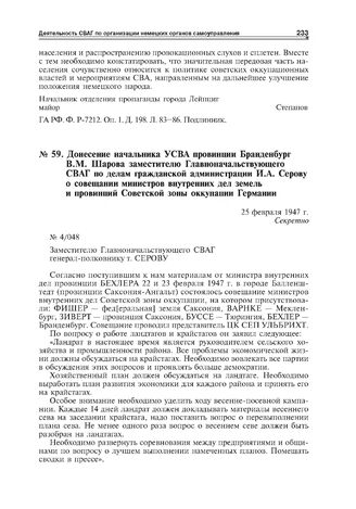 Донесение начальника УСВА провинции Бранденбург В.М. Шарова заместителю Главноначальствующего СВАГ по делам гражданской администрации И.А. Серову о совещании министров внутренних дел земель и провинций Советской зоны оккупации Германии. 25 февраля 1947 г. // ГА РФ. Ф. Р-7077. Оп. 1. Д. 215. Л. 49-51. Заверенная копия.
