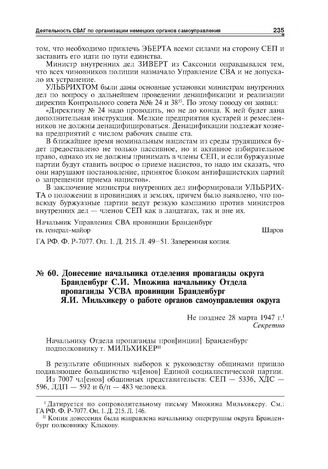 Донесение начальника отделения пропаганды округа Бранденбург С.И. Множина начальнику Отдела пропаганды УСВА провинции Бранденбург Я.И. Мильхикеру о работе органов самоуправления округа. Не позднее 28 марта 1947 г. // ГА РФ. Ф. Р-7077. Оп. 1. Д. 215. Л. 147-152. Подлинник.
