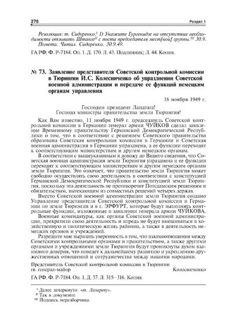 Заявление представителя Советской контрольной комиссии в Тюрингии И.C. Колесниченко об упразднении Советской военной администрации и передаче ее функций немецким органам управления. 16 ноября 1949 г.