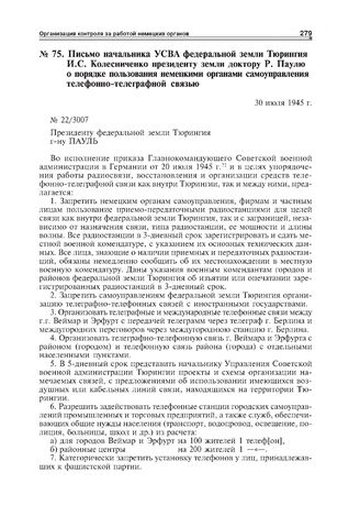 Письмо начальника УСВА федеральной земли Тюрингия И.С. Колесниченко президенту земли доктору Р. Паулю о порядке пользования немецкими органами самоуправления телефонно-телеграфной связью. 30 июля 1945 г. // ГА РФ. Ф. Р-7184. Оп. 1. Д. 4. Л. 201-202. Копия.
