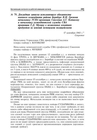 Документы о взаимоотношениях военных комендатур, опергрупп НКВД и немецкого самоуправления. Сентябрь - октябрь 1945 г. Докладная записка исполняющего обязанности военного коменданта района Вернбург B.H Громова начальнику УСВА провинции Саксония A.Г. Котикову и начальнику комендантской службы СВА провинции Г.Д. Мухину о незаконных изъятиях продуктов из имений немецкими полицейскими. 17 сентября 1945 г.