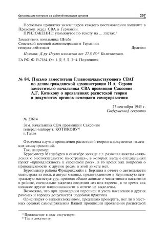 Письмо заместителя Главноначальствующего СВАГ по делам гражданской администрации И.А. Серова заместителю начальника СВА провинции Саксония А.Г. Котикову о проявлениях расистской теории в документах органов немецкого самоуправления. 27 сентября 1945 г.