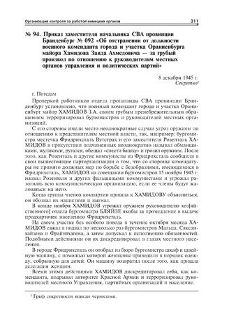 Приказ заместителя начальника СВА провинции Бранденбург № 092 «Об отстранении от должности военного коменданта города и участка Ораниенбурга майора Хамидова Заида Ахмедовича - за грубый произвол по отношению к руководителям местных органов управления и политических партий». Подсдам, 8 декабря 1945 г.