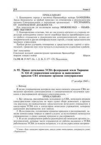 Приказ начальника УСВА федеральной земли Тюрингия № 124 об упорядочении контроля за выполнением приказов СВА немецкими органами самоуправления. 17 декабря 1945 г. // ГА РФ. Ф. Р-7184. Оп. 2. Д. 1. Л. 250-251. Подлинник.
