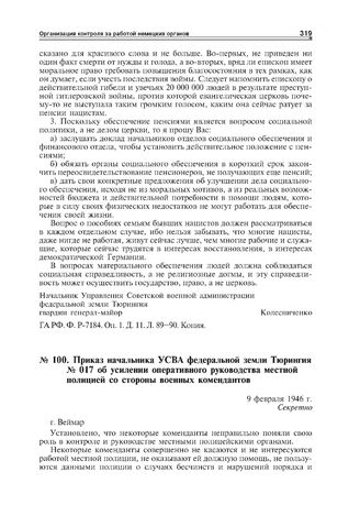 Приказ начальника УСВА федеральной земли Тюрингия № 017 об усилении оперативного руководства местной полицией со стороны военных комендантов. Веймар, 9 февраля 1946 г. // ГА РФ. Ф. P-7184. Оп. 1. Д. 7. Л. 52-53. Заверенная копия.