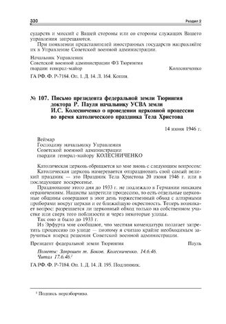 Письмо президента федеральной земли Тюрингия доктора Р. Пауля начальнику УСВА земли И.С. Колесниченко о проведении церковной процессии во время католического праздника Тела Христова. Веймар, 14 июня 1946 г. // ГА РФ. Ф. Р-7184. Оп. 1. Д. 14. Л. 195. Подлинник.