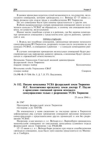 Письмо начальника УСВА федеральной земли Тюрингия И.С. Колесниченко президенту земли доктору Р. Паулю о проведении совещаний органов немецкого самоуправления только с разрешения УСВА Тюрингии. 25 июля 1946 г. // ГА РФ. Ф. Р-7184. Оп. 1. Д. 14. Л. 430. Копия.