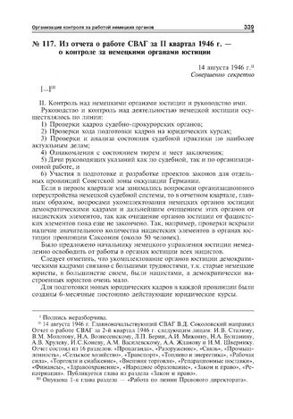 Из отчета о работе СВАГ за II квартал 1946 г. - о контроле за немецкими органами юстиции. 14 августа 1946 r. // ГА РФ. Ф. P-7317. Оп. 7. Д. 34. Л. 215-218. Заверенная копия.