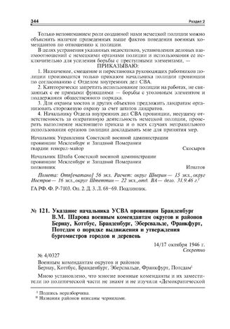 Указание начальника УСВА провинции Бранденбург В.М. Шарова военным комендантам округов и районов Бернау, Коттбус, Бранденбург, Эберсвальде, Франкфурт, Потсдам о порядке выдвижения и утверждения бургомистров городов и деревень. 14/17 октября 1946 г.