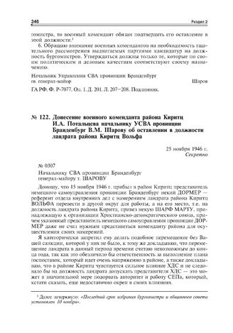 Донесение военного коменданта района Киритц И.А. Потальцева начальнику УСВА провинции Бранденбург В.М. Шарову об оставлении в должности ландрата района Киритц Вольфа. 25 ноября 1946 г. // ГА РФ. Ф. Р-7077. Оп. 1. Д. 202. Л. 159. Подлинник.