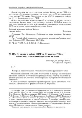 Из отчета о работе СВАГ за III квартал 1946 г. - о контроле за немецкими органами юстиции. 29 ноября / 11 декабря 1946 г.