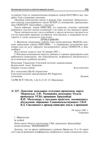 Донесение начальника отделения пропаганды округа Эберсвальде З.Ф. Розенцвайга начальнику Отдела пропаганды УСВА провинции Бранденбург Я.И. Мильхикеру о заседании крайстага, посвященного обсуждению обращения Главноначальствующего СВАГ В.Д. Соколовского к премьер-министрам земель и провинций. Эберсвальде, 19 марта 1947 г. // ГА РФ. Ф. Р-7077. Оп. 1. Д. 215. Л. 67-71. Подлинник.