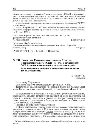 Директива Главноначальствующего СВАГ - Гланокомандующего ГСОВГ № 1 / 78 начальникам УСВА земель и провинций о недостатках в деле демократизации немецкого самоуправления и мерах по их устранению. 13 мая 1947 г. // ГА РФ. Ф. P-7317. Оп. 7. Д. 57. Л. 32-35. Подлинник.