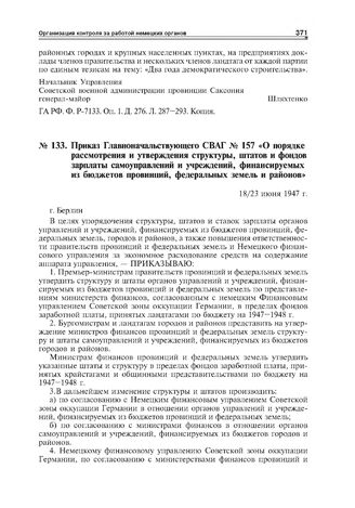 Приказ Главноначальствующего СВАГ № 157 «О порядке рассмотрения и утверждения структуры штатов и фондов зарплаты самоуправлений и учреждений, финансируемых из бюджетов провинций, федеральных земель и районов». Берлин, 18/23 июня 1947 г.