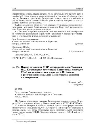 Письмо начальника УСВА федеральной земли Тюрингия И.C. Колесниченко заместителю Главноначальствующего СВАГ по экономическим вопросам K.И. Ковалю о реорганизации земельного Министерства хозяйства и планирования. 20 июня 1947 г.