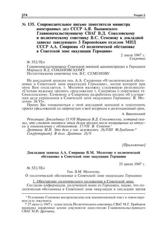 Сопроводительное письмо заместителя министра иностранных дел СССР A.Я. Вышинского Главноначальствующему СВАГ B.Д. Соколовскому и политическому советнику B.C. Семенову к докладной записке заведующего 3 Европейским отделом МИД СССР A.A. Смирнова «О политической обстановке в Советской зоне оккупации Германии». 2 июля 1947 г. // ГА РФ. Ф. P-7317. Оп. 1. Д. 6. Л. 111-116. Заверенная копия.