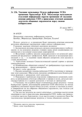 Указание начальника Отдела информации УСВА провинции Бранденбург Я.И. Мильхикера начальникам отделений информации округов провинции об оказании помощи райкомам СЕП в проведении отчетной кампании депутатов общинных парламентов перед своими избирателями. 21 июля 1947 г.