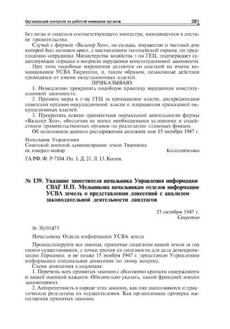 Указание заместителя начальника Управления информации СВАГ И.П. Мельникова начальникам отделов информации УСВА земель о представлении донесений с анализом законодательной деятельности ландтагов. 23 октября 1947 г. // ГА РФ. Ф. P-7077. Оп. 1. Д. 214. Л. 46. Подлинник.