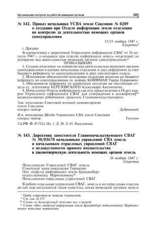 Директива заместителя Главноначальствующего СВАГ № 30/01670 начальникам управлений СВА земель и начальникам отраслевых управлений СВАГ о недопустимости прямого вмешательства в законотворческую деятельность немецких органов земель. 28 ноября 1947 г. // ГА РФ. Ф. Р-7077. Оп. 1. Д. 214. Л. 71. Заверенная копия.