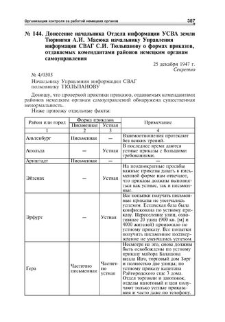 Донесение начальника Отдела информации УСВА земли Тюрингия A.И. Масюка начальнику Управления информации СВАГ С.И. Тюльпанову о формах приказов, отдаваемых комендантами районов немецким органам самоуправления. 25 декабря 1947 г.