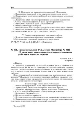 Приказ начальника УСВА земли Мекленбург № 0116 «О назначении перемещении и смещении руководящих работников немецких округов». Шверин, 27 июля 1948 г. // ГА РФ. Ф. Р-7103. Оп. 1. Д. 34. Л. 27-28. Подлинник.