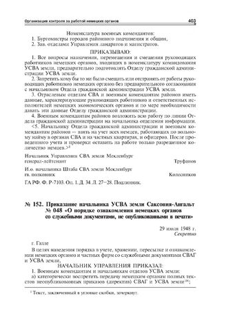 Приказание начальника УСВА земли Саксония-Ангальт № 048 «О порядке ознакомления немецких органов со служебными документами не опубликованными в печати». Галле, 29 июля 1948 г.