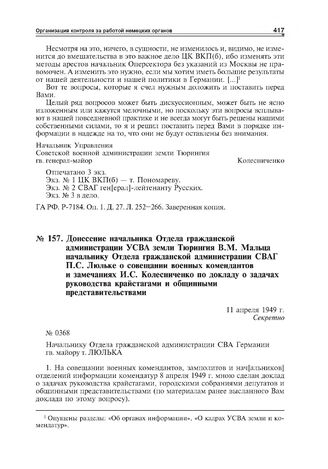 Донесение начальника Отдела гражданской администрации УСВА земли Тюрингия B.M. Мальца начальнику Отдела гражданской администрации СВАГ П.С. Люльке о совещании военных комендантов и замечаниях И.C. Колесниченко по докладу о задачах руководства крайстагами и общинными представительствами. 11 апреля 1949 г. // ГА РФ. Ф. Р-7184. Оп. 1. Д. 136. Л. 185-186. Подлинник.