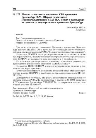Письмо заместителя начальника СВА провинции Бранденбург В.М. Шарова заместителю Главноначальствующего СВАГ И.А Серову о кандидатуре на должность вице-президента провинции Бранденбург. 20 сентября 1945 г.