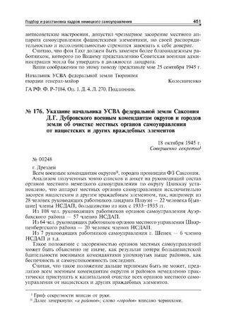 Указание начальника УСВА федеральной земли Саксония Д.Г. Дубровского военным комендантам округов и городов земли об очистке местных органов самоуправления от нацистских и других враждебных элементов. Дрезден, 18 октября 1945 г.