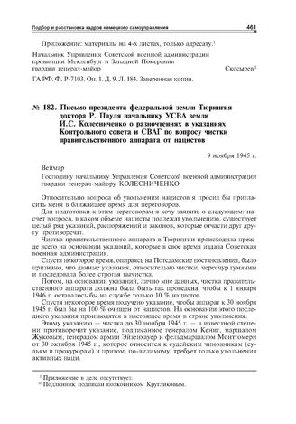 Письмо президента федеральной земли Тюрингия доктора Р. Пауля начальнику УСВА земли И.С. Колесниченко о разночтениях в указаниях Контрольного совета и СВАГ по вопросу чистки правительственного аппарата от нацистов. Веймар, 9 ноября 1945 г. // ГА РФ. Ф. Р-7184. Оп. 1. Д. 4. Л. 160-161. Подлинник.