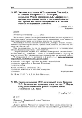 Письмо начальника УСВА федеральной земли Тюрингия И.С. Колесниченко президенту земли доктору Р. Паулю о неудовлетворительной работе ландрата района Мюльхаузен А.Г. Гаазе. 27 ноября 1945 г.