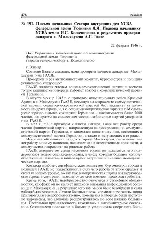 Письмо начальника Сектора внутренних дел УСВА федеральной земли Тюрингия Я.Я. Иванова начальнику УСВА земли И.С. Колесниченко о результатах проверки ландрата г. Мюльхаузена А.Г. Гаазе. 22 февраля 1946 г. // ГА РФ. Ф. Р-7184. Оп. 1. Д. 11. Л. 204-205. Подлинник.