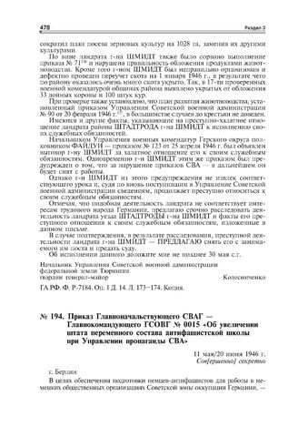 Приказ Главноначальствующего СВАГ - Главнокомандующего ГСОВГ № 0015 «Об увеличении штата переменного состава антифашистской школы при Управлении пропаганды СВА». Берлин, 11 мaя / 20 июня 1946 г.