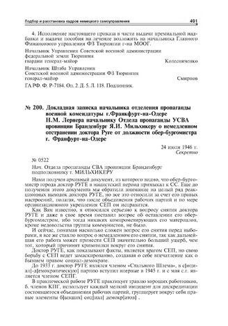 Докладная записка начальника отделения пропаганды военной комендатуры г. Франкфурт-на-Одере Н.М. Лернера начальнику Отдела пропаганды УСВА провинции Бранденбург Я.И. Мильхикеру о немедленном отстранении доктора Руге от должности обер-бургомистра г. Франкфурт-на-Одере. 24 июля 1946 г. // ГА РФ. Ф. Р-7077. Оп. 1. Д. 200. Л. 493-495. Подлинник; Л. 496. Заверенная копия. Л. 497. Копия.