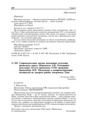 Сопроводительное письмо начальника отделения пропаганды округа Эберсвальде З.Ф. Розенцвайга начальнику Отдела пропаганды УСВА провинции Бранденбург Я.И. Мильхикеру к компрометирующим материалам на ландрата района Ангермюнде Лёше. 10 августа 1946 г.// ГА РФ. Ф. Р-7077. Оп. 1 . Д. 201. Л. 19. Подлинник; Л. 20-26. Копия.