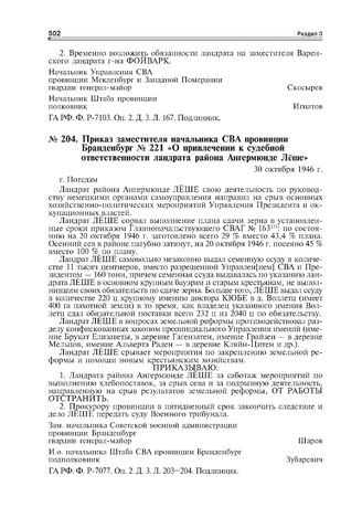 Приказ заместителя начальника СВА провинции Бранденбург № 221 «О привлечении к судебной ответственности ландрата района Ангермюнде Лёше». Потсдам, 30 октября 1946 г. // ГА РФ. Ф. Р-7077. Оп. 2. Д. 3. Л. 203-204. Подлинник.