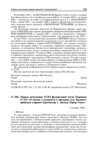 Приказ начальника УСВА федеральной земли Тюрингия № 514 «О снятии с должности и предании суду Военного трибунала старшего бургомистра г. Апольда Бергер Ганса». Веймар, 7 декабря 1946 г. // ГА РФ. Ф. Р-7184. Оп. 2. Д. 6. Л. 229. Подлинник.