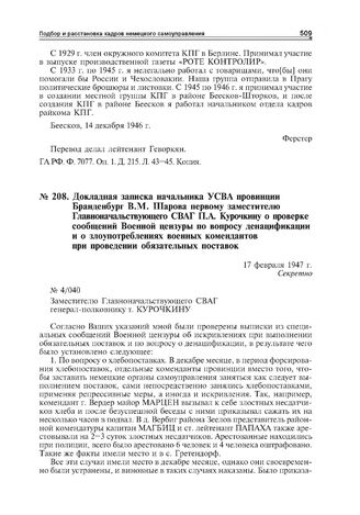Докладная записка начальника УСВА провинции Бранденбург B.M. Шарова первому заместителю Главноначальствующего СВАГ П.А. Курочкину о проверке сообщений Военной цензуры по вопросу денацификации и о злоупотреблениях военных комендантов при проведении...