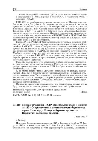 Приказ начальника УСВА федеральной земли Тюрингия № 112 «О привлечении к ответственности бургомистра города Йена фрау Позырь и бургомистра города Нордхаузен господина Гиммлер». Веймар, 7 мая 1947 г.