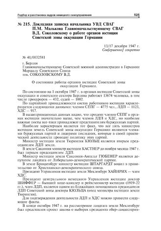 Докладная записка начальника УВД СВАГ П.M. Малькова Главноначальствующему СВАГ В.Д. Соколовскому о работе органов юстиции Советской зоны оккупации Германии. 13/17 декабря 1947 г.