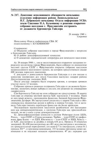 Донесение исполняющего обязанности начальника отделения информации района Диппольдисвальде H.Г. Дубровского начальнику Отдела информации УСВА земли Саксония H.A. Кузьминову о решении открытого собрания населения г. Фрауэнштайн отстранить от должности бургомистра Гайслера. 26 января 1948 г.